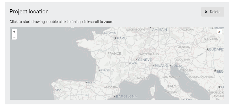 Configuring the project location opens a small world map. The location is drawn to this window by clicking, double-click finishes the area and creates closed polyline. Map window can be zoomed by holding CTRL and scrolling to the wanted area.&#x20;