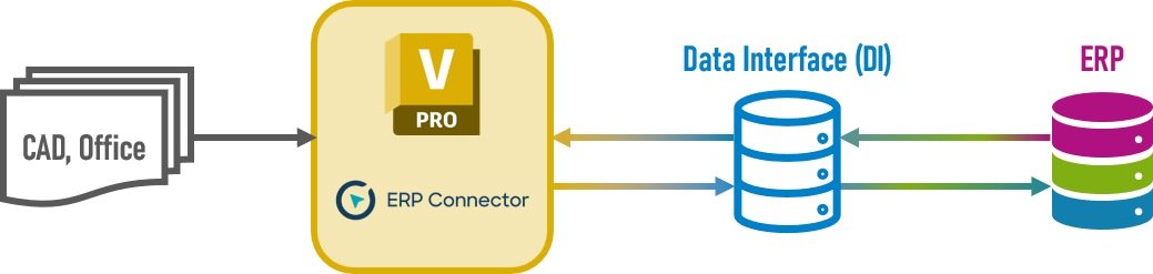 To enable data exchange between Autodesk Vault Professional and the ERP system via the ERP Connector, a shared "connection point" is required. This connection point is established through a so-called *Data Interface* (*DI*) created in a dedicated Microsoft SQL database. Both Vault Professional/ERP Connector and the ERP system connect to this database, allowing them to send (export) and read (import) data as needed.