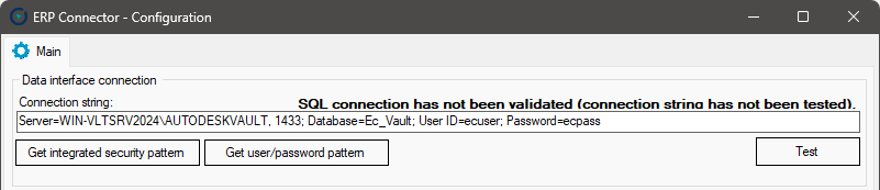 1. Versions of the ERP Connector built on .NET Core technology (released after May 2025) must contain the following information at the end of the connection string: `TrustServerCertificate=True;`<br>