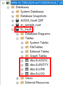 2. After this step, nothing changed in the ERP Connector configuration window, but in the Ec\_Vault database, four tables were created: `dbo.EcASSOC`, `dbo.EcENTITY`, `dbo.EcLINK`, and `dbo.EcLOG`. In other words, the Data Interface tables were created.<br>