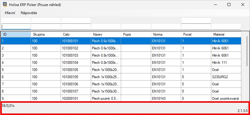 Additional information about the data retrieved from the database and the application version is displayed at the bottom of the Holixa ERP Picker window (Preview only).