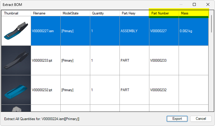 The Extract BOM command extracts the content of the Bill of Materials (BOM) and saves it to an *.xlsx file either next to the original file, or to a specified folder. On top of that, users can select what iProperties should be appended to the extracted BOM table.
