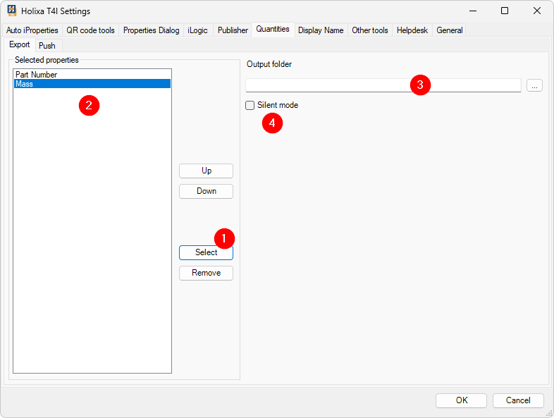 Users can select (1) file iProperties to be appended to the extracted BOM. Selected iProperties will be displayed in the list (2), where they can be ordered using the Up and Down buttons.