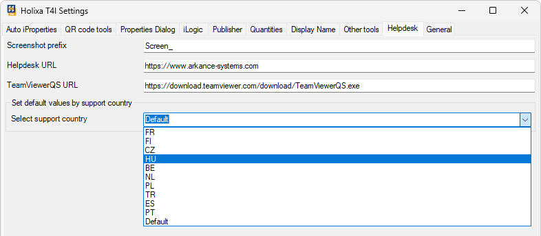 In a default state after the installation, Helpdesk URL, TeamViewerQS URL, and the support country fields are empty. When the support page is first accessed (see the [Helpdesk web](https://help.besmart.software/older-26.0.0/commands-overview/helpdesk/helpdesk-web) command), the user can select the desired country of technical support. Field values in the Helpdesk tab are then adjusted accordingly. If necessary, they can be changed any time later - either by selecting from the Select support country drop-down list or manually by entering the custom values directly.