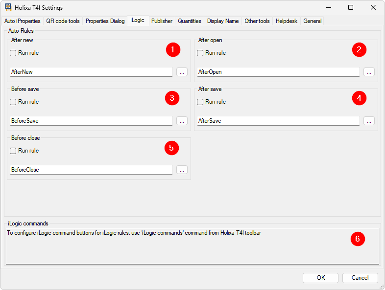 Sections 1 to 5 allow users to pair the application events and iLogic rules that should be executed on the application events. The iLogic rules can be of the following two types: