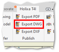 This command exports a drawing to a DWG file. The export can be manual or automatic on the save event. The command can be configured in the Holixa T4I Settings window on the Publisher -> DWG tab.