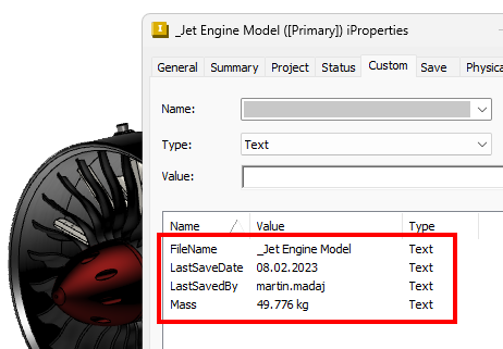 Given the specific settings for the assembly file depicted in the images above, four iProperties were automatically added to the document: *Filename*, *LastSaveDate*, *LastSavedBy*, and *Mass*.