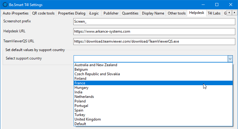 In a default state after the installation, Helpdesk URL, TeamViewerQS URL, and the support country fields are empty. When the support page is first accessed (see the [Helpdesk web](https://help.besmart.software/t4i/commands-overview/helpdesk/helpdesk-web) command), the user can select the desired country of technical support. Field values in the Helpdesk tab are then adjusted accordingly. If necessary, they can be changed any time later - either by selecting from the Select support country drop-down list or manually by entering the custom values directly.