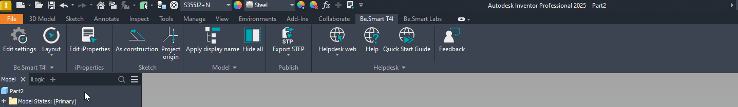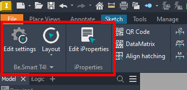 That's the old good icon layout with one improvement. We adjusted the *Be.Smart T4I* panel by moving the *Edit settings* command to the very left on the ribbon, adding the command to switch between layouts, hiding the *iLogic commands* button, and moving the *Edit iProperties* command to its own dedicated panel. The arrangement of commands is therefore more logical than in older T4I versions.&#x20;