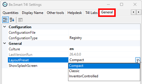*Be.Smart T4I* ribbon -> *Be.Smart T4I* panel -> *Advanced settings* -> General tab -> General -> LayoutPreset.