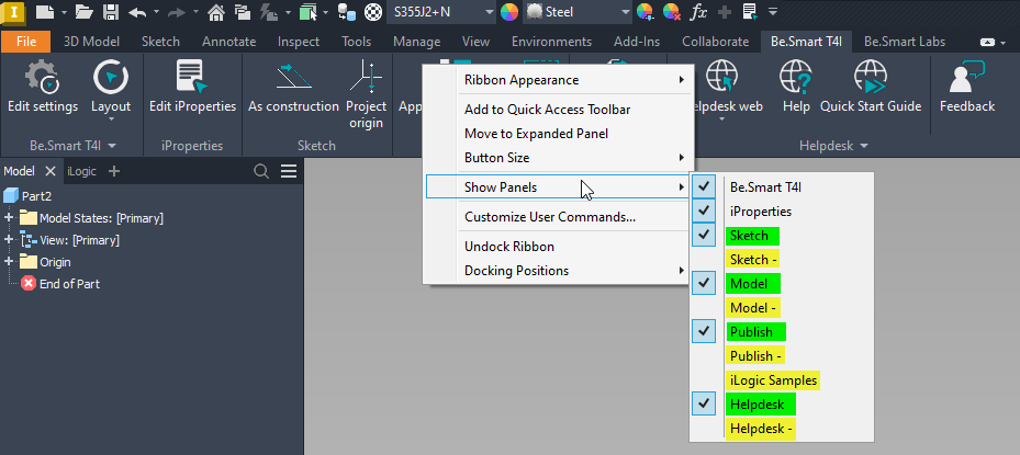 3. Upon Inventor restart, your changes to the Be.Smart T4I ribbon will be retained.