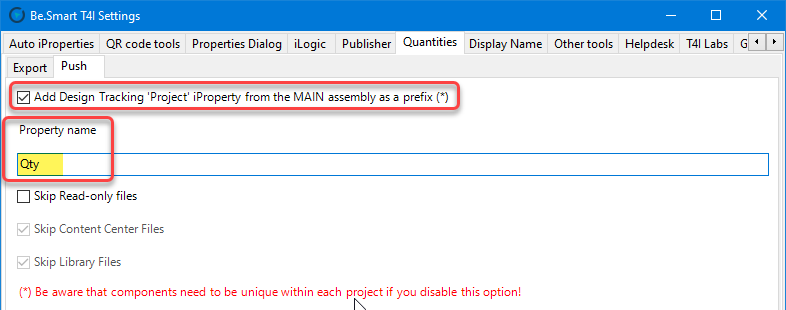 2. In Be.Smart `Be.Smart T4I ribbon -> Be.Smart T4I -> Edit settings -> Quantities -> Push` verify the *Add Design Tracking 'Project' iProperty from the MAIN assembly as a prefix* **is** *checked* and enter a value for the *Property name* field.