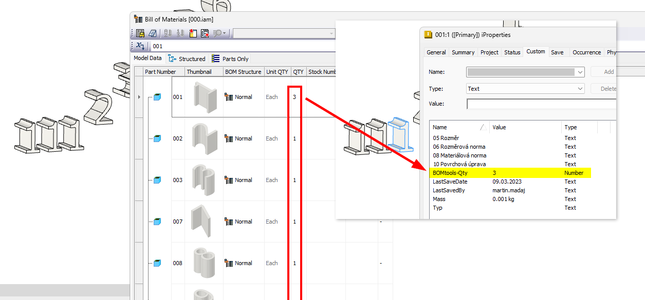 1. The resulting iProperty name containing the quantity will be composed of the Project iProperty and the Property name, e.g. *BOMtools-Qty*.