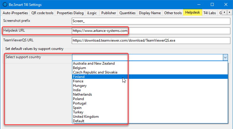 Helpdesk URL can be changed to provide access to the technical support portal. It can be done either manually by directly entering the required URL address, or one of the predefined URLs can be set automatically by selecting the support country from the dropdown list.