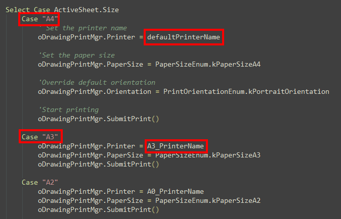 This is a sample iLogic command that enables users to redirect the printing task to the appropriate installed printer based on the drawing sheet dimensions. It means, for example, that the A4 drawings can be printed on a different printer than the A3 drawing, etc. This command can be used in conjunction with the Installed printers command. Once properly set up, users don't need to manually select printers based on the drawing sheet size
