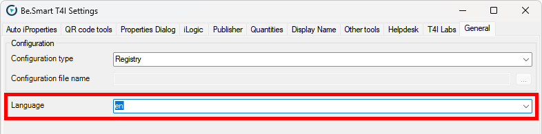 If needed, the T4I language can be changed from Be.Smart T4I (ribbon) -> Be.Smart T4I (panel) -> Edit settings -> General tab.