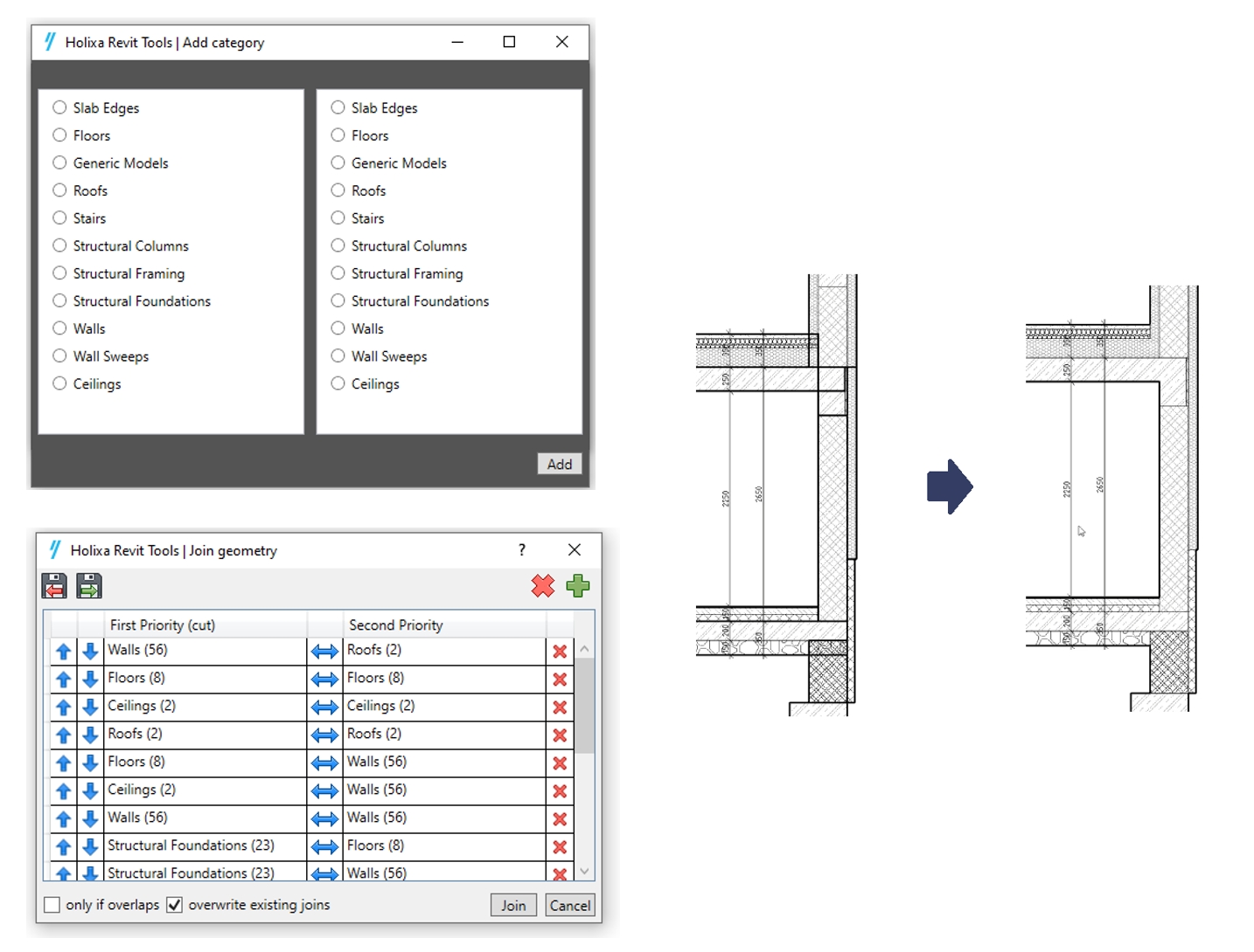 Mass joining of elements by selected categories, including the option to set the first and second level priority.